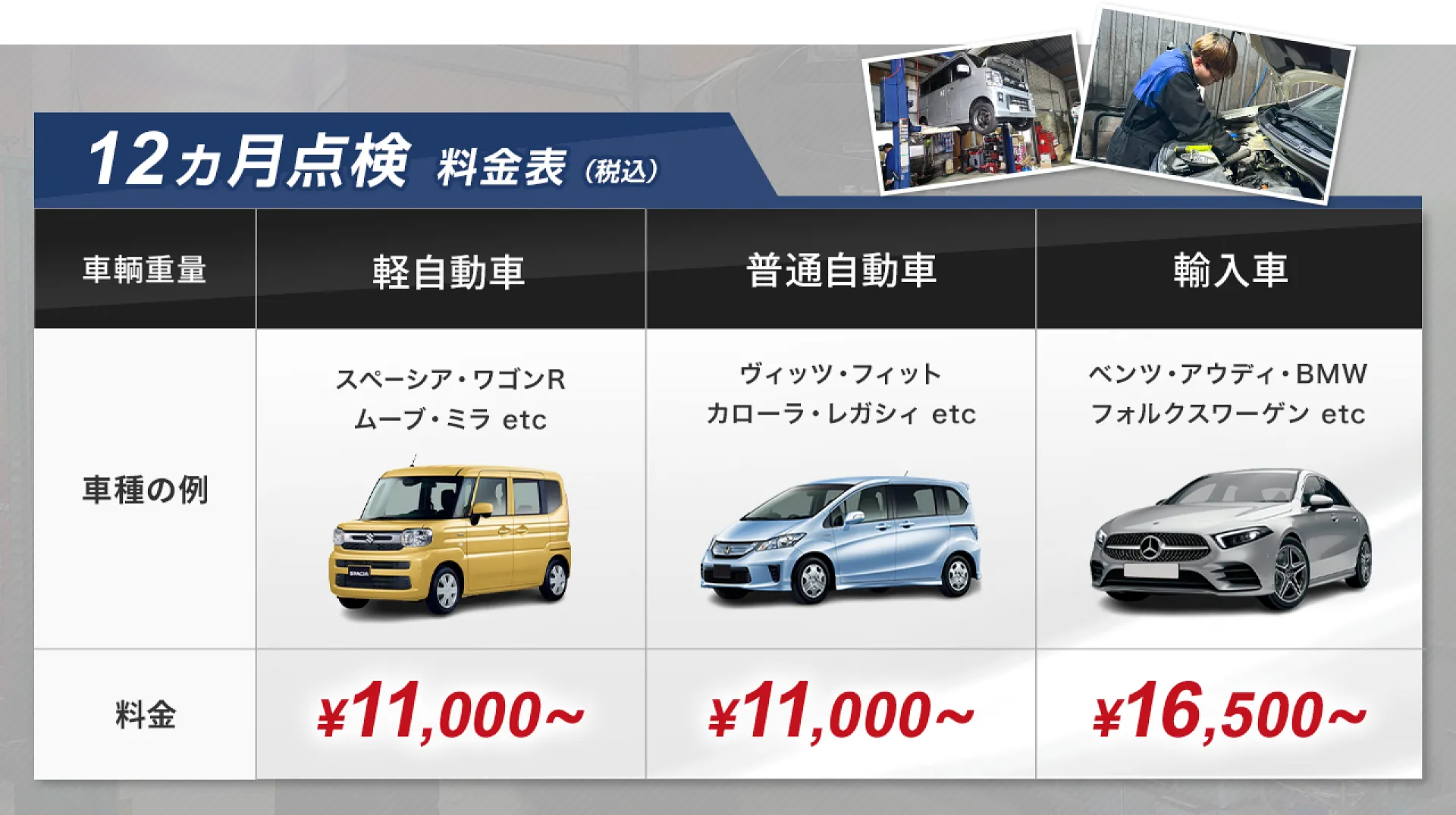 ※輸入車とダブルタイヤ車輌は別途5,500円~必要となります。