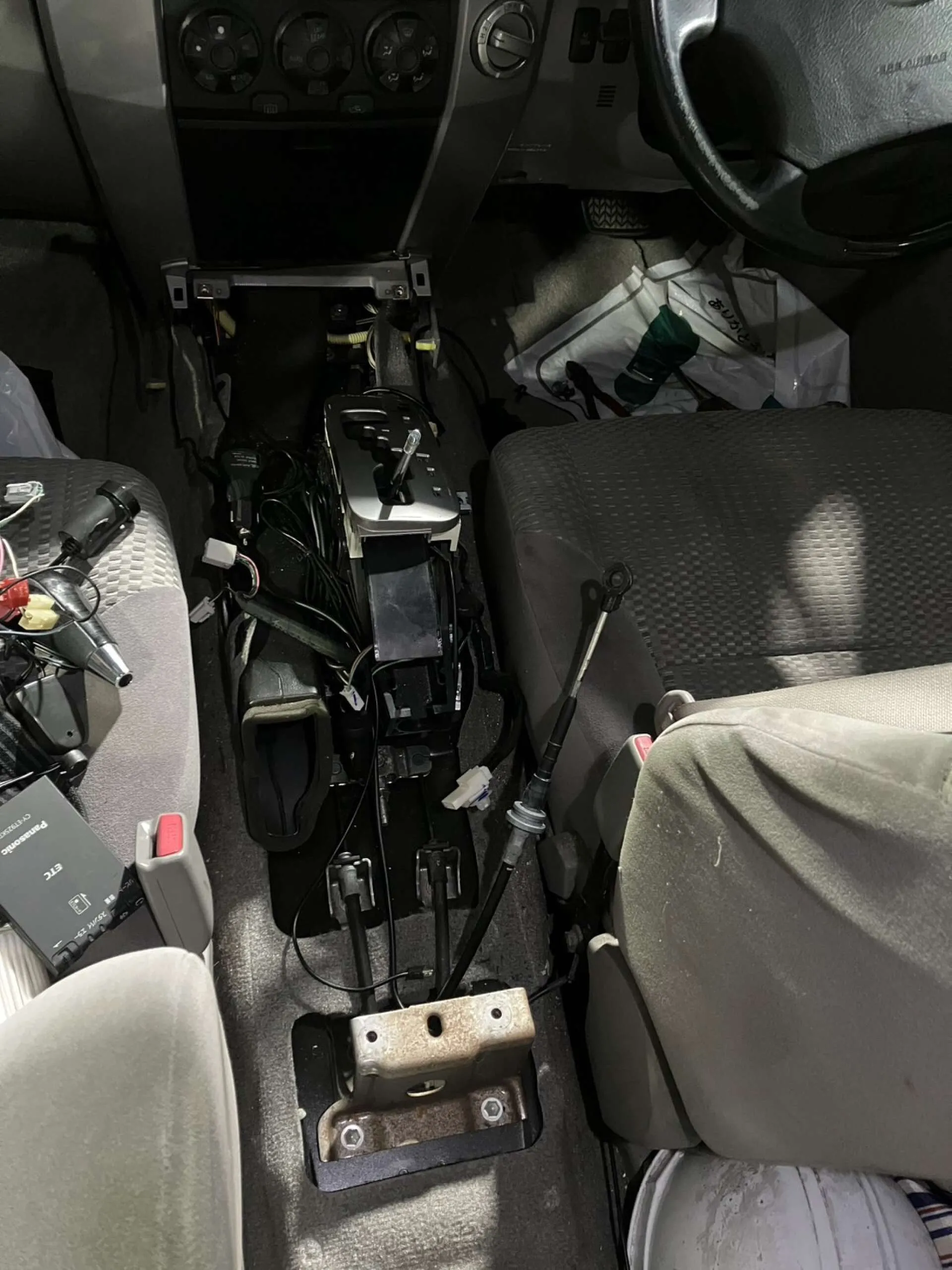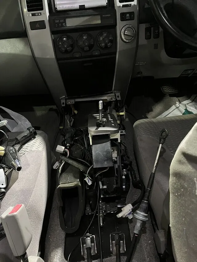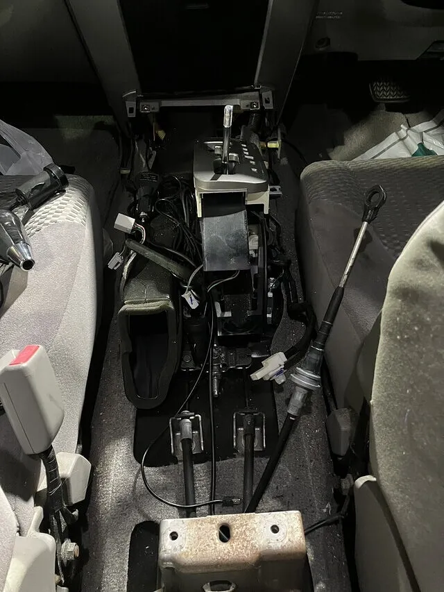 シフトケーブル交換にあたり、まずセンターコンソールを外し、シフトレバーを固定するボルトを緩めます。